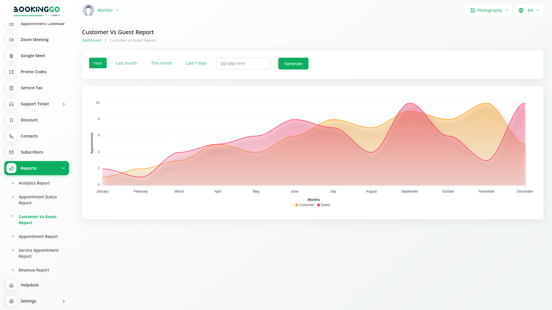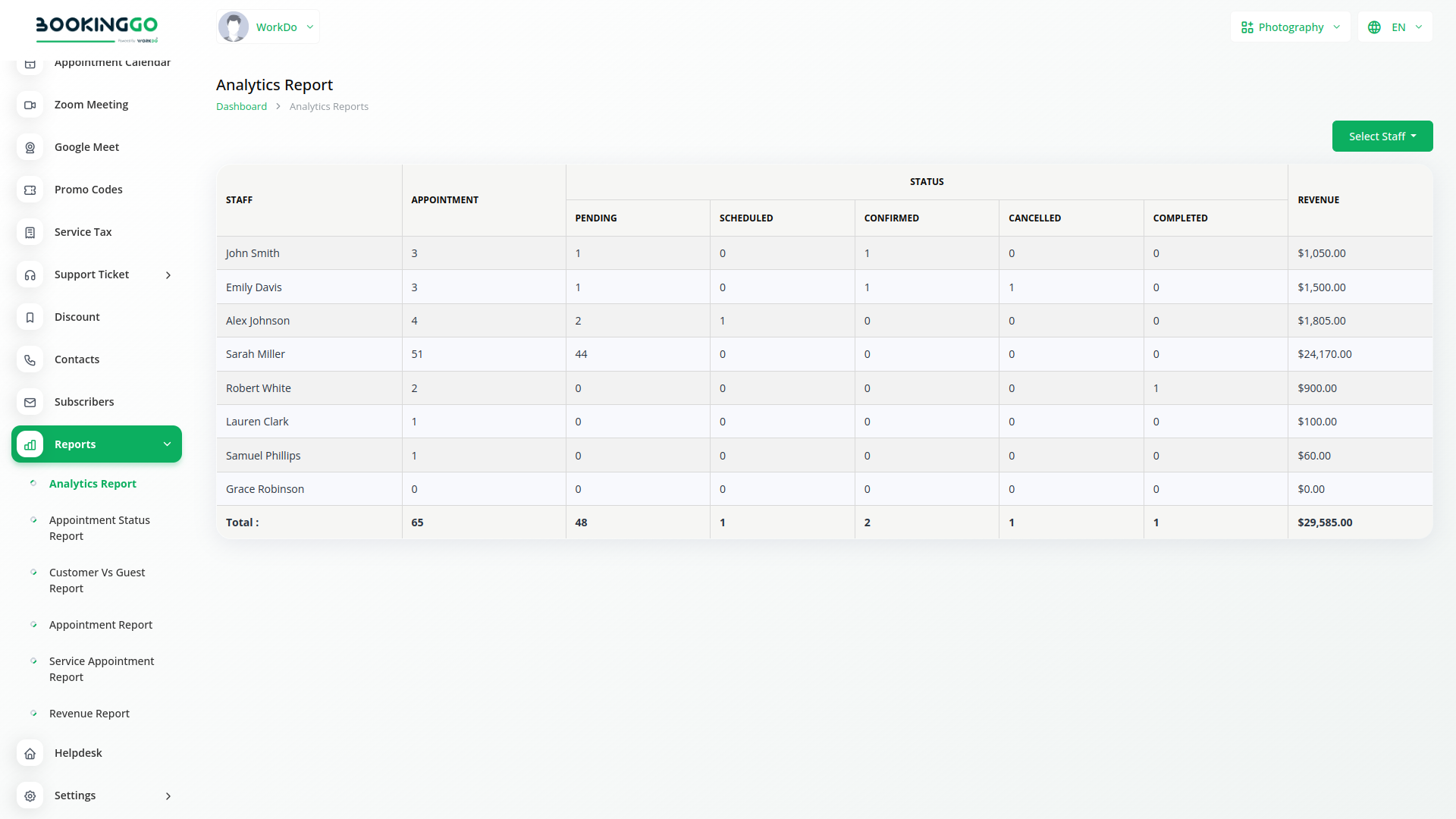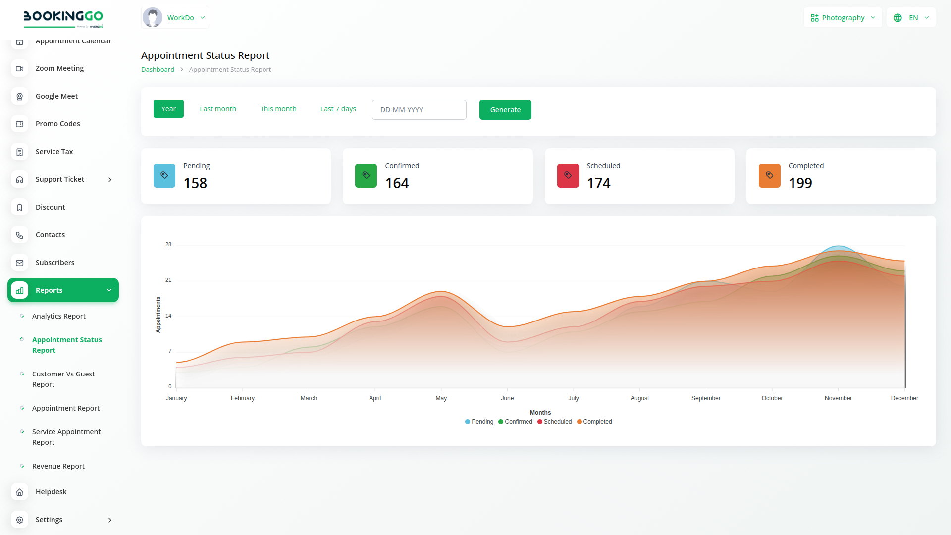 The Reports module in BookingGo SaaS is designed to provide comprehensive insights into your business operations, specifically focusing on key metrics and performance indicators. This module allows you to generate detailed reports that help you monitor and analyze various aspects of your service appointments and customer interactions. With its intuitive interface and powerful reporting capabilities, the Reports module empowers you to make data-driven decisions and optimize your business effectively.