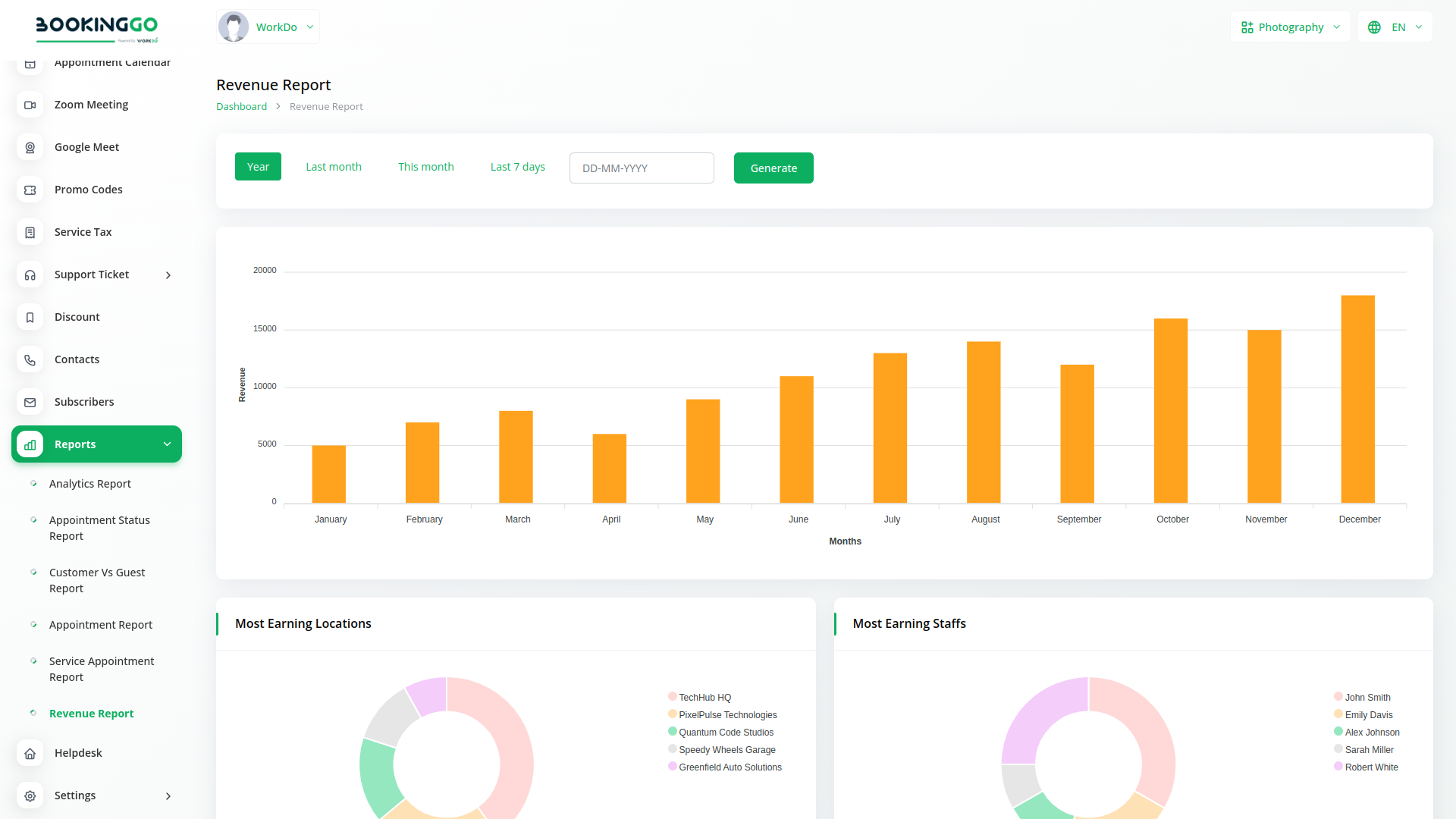 The Revenue Report is a vital component of the Reports module, providing a comprehensive overview of your business's financial performance. This report details the income generated from appointments, broken down by service type, period, and customer segments. It helps you track your earnings, identify revenue trends, and forecast future financial performance. By analyzing this report, you can make informed decisions about pricing strategies, budget allocations, and growth initiatives, ensuring the financial health and sustainability of your business.